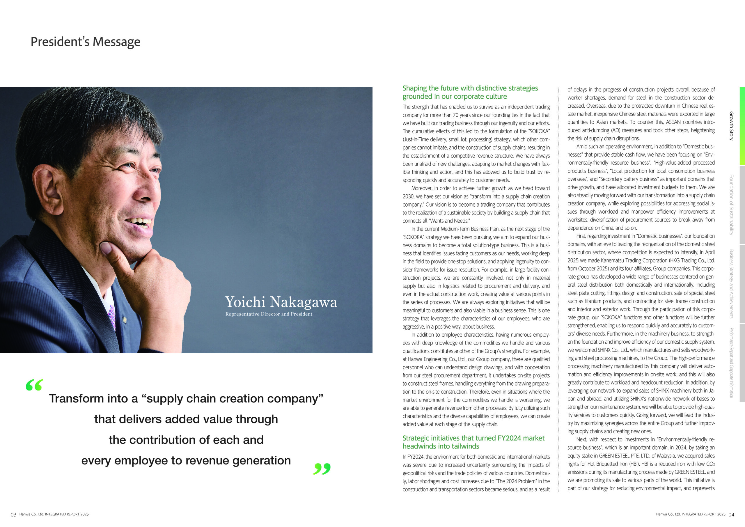 In this year’s report, we present the President’s Message, the progress of our Medium-Term Business Plan 2025 “Run up to HANWA 2030 – Soar into the next stage challenging the status quo,” and enhanced disclosures on our sustainability initiatives and risk management framework. We have also included an Audit and Supervisory Committee Member Roundtable to further deepen understanding of our governance structure.